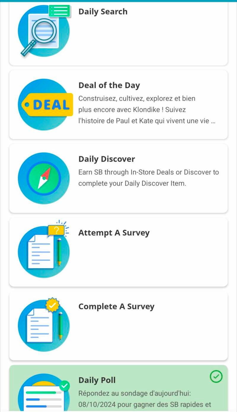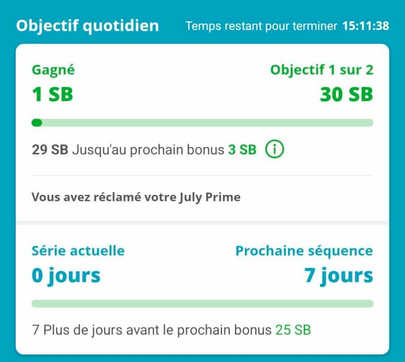 Mon objectif quotidien du jour est de 30SB (SB : ce sont les points). Si je fais un sondage de 30sb je vais avoir 3SB supplémentaire (comme indiqué sur l'image). Je vais ensuite débloquer un autre objectif qui va me rapporter encore des points bonus.
